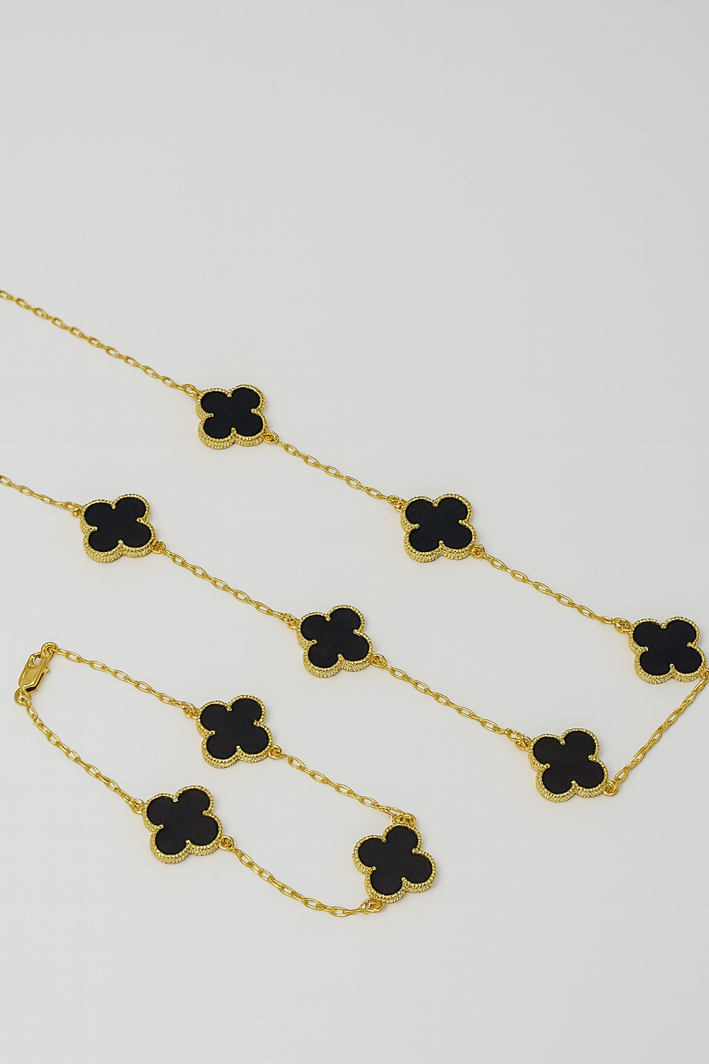 Kit Corrente Trevo Preta 55cm + Pulseira Trevo Preta Banhado A Ouro 18K