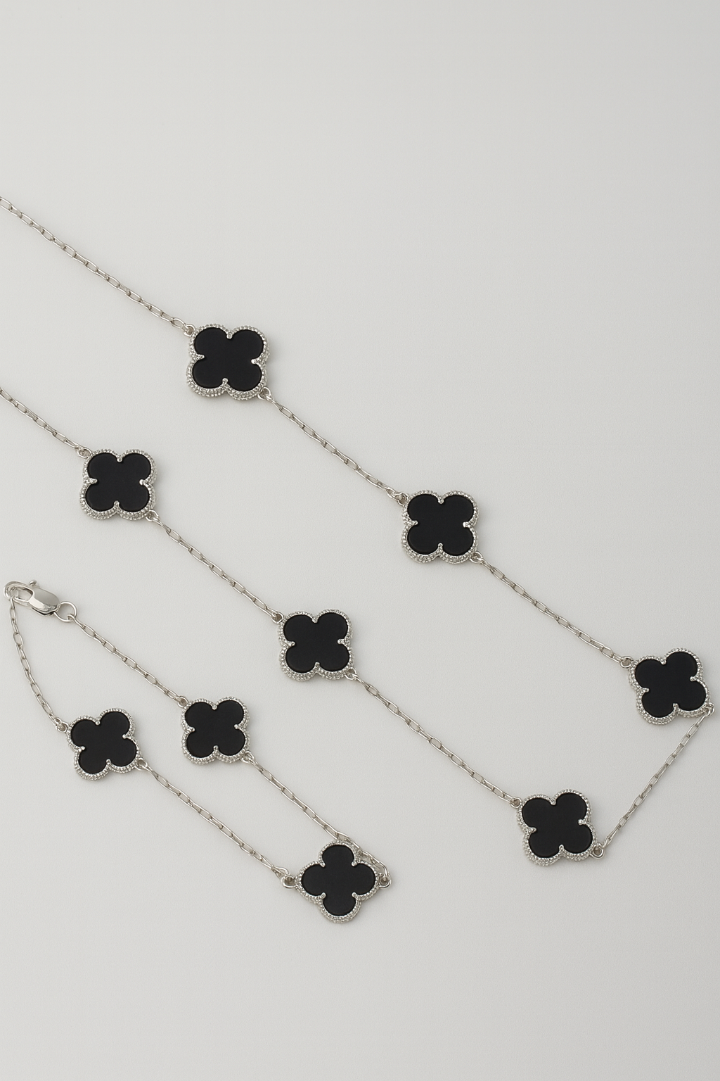 Kit Corrente Trevo Preta 55cm + Pulseira Trevo Preta Banhado A Ouro Branco